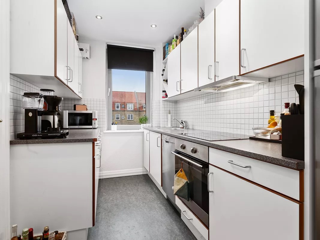 Køkkenet imponerer med rigelig skabsplads og en praktisk opvaskemaskine, samtidig med at du kan nyde udsigten til den rolige og hyggelige baggård.